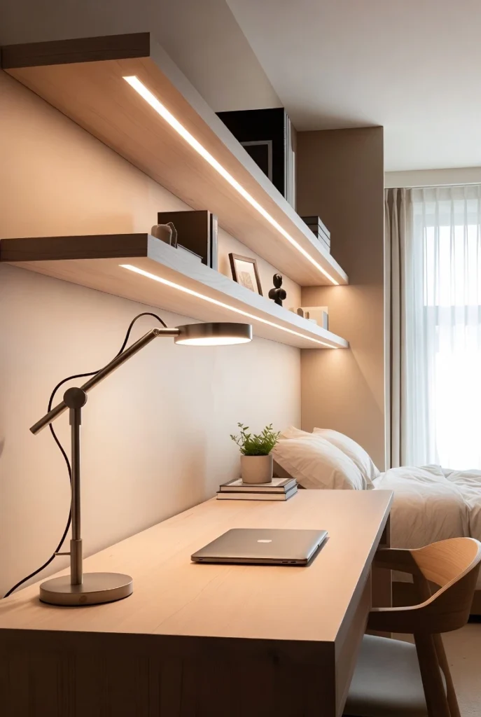 Floating shelves saved my sanity when I was working in a bedroom that barely fit my bed. I mounted two shelves above my desk for books and supplies, added a pegboard for headphones and cables, and suddenly had room to actually work on my desk instead of just stacking stuff on it.